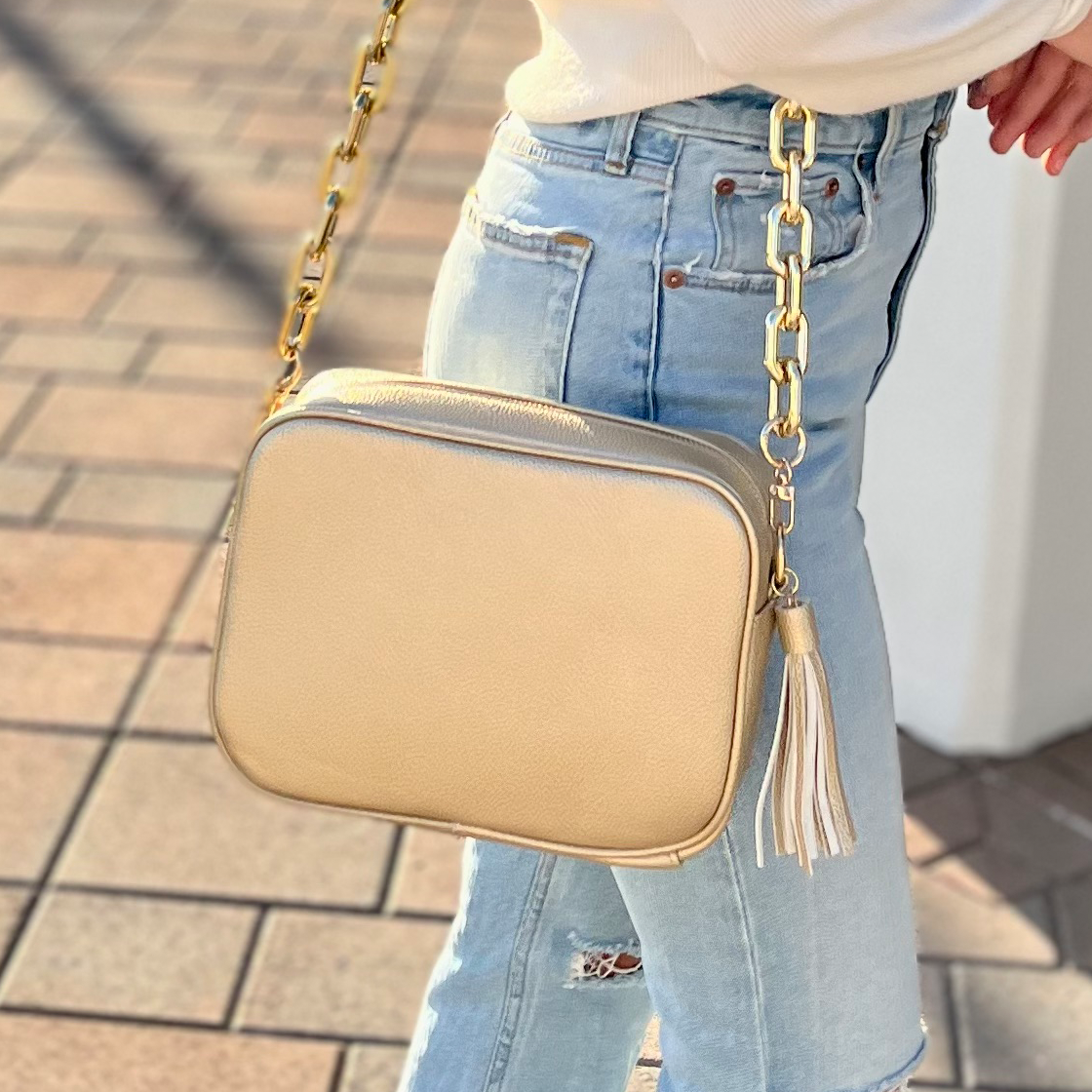 This cute little camera bag will score big with our sports fans, crafted with a soft vegan leather trim you have 9 colors to choose from. Included is a matching ADJUSTABLE vegan leather strap with a zipper top closure to keep your items safe & secure.